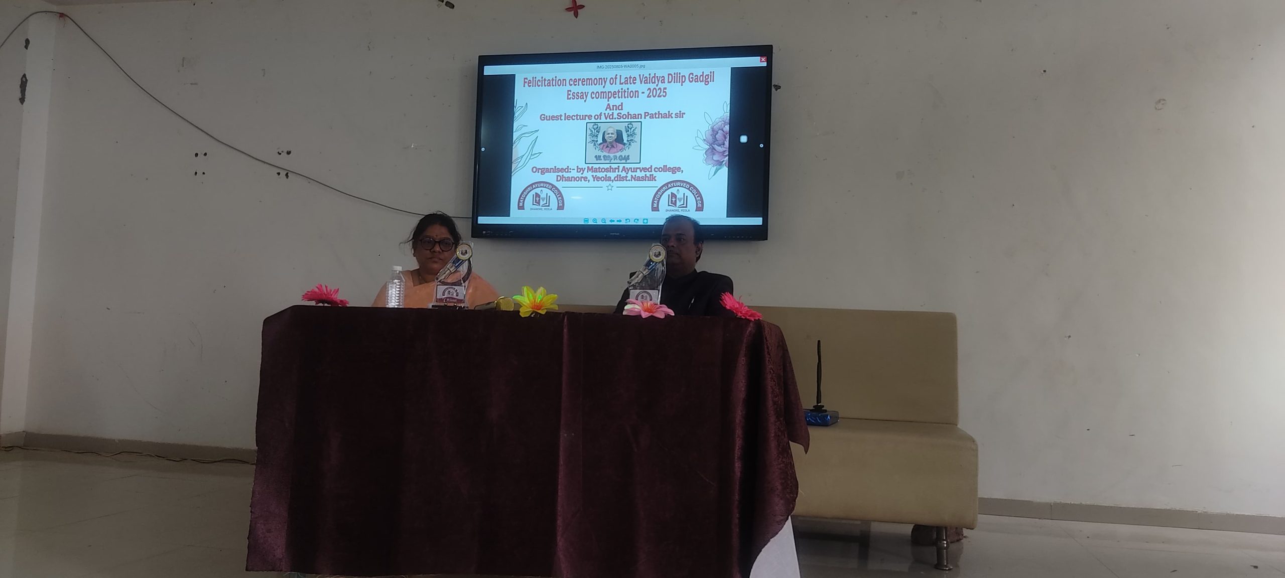 The Guest Lecture by Vaidya Sohan Pathak and the Felicitation Ceremony of the Late Vaidya Dilip Gadgil Essay Competition 2025 were successfully conducted today at Matoshri Ayurved College, Dhanore, Yeola.